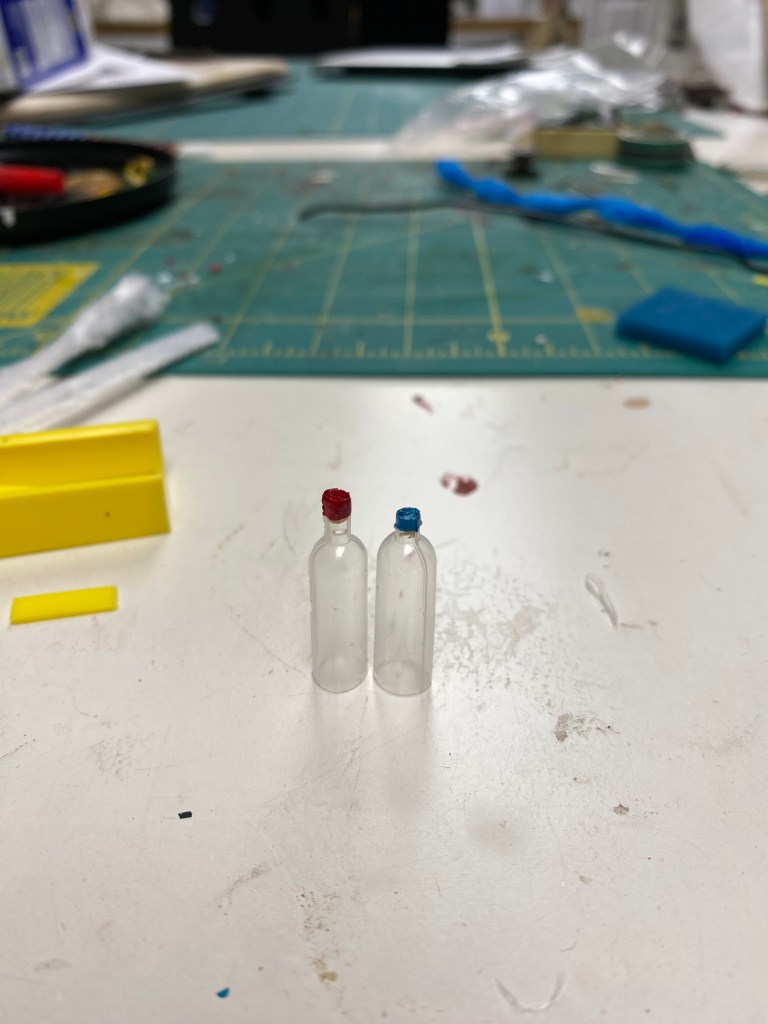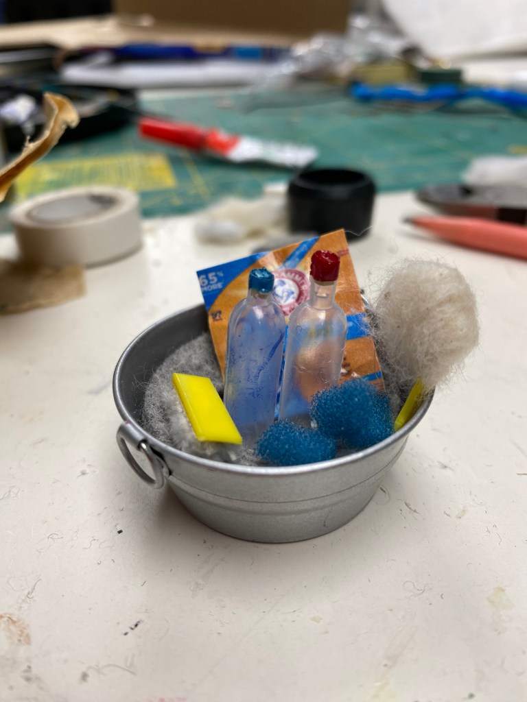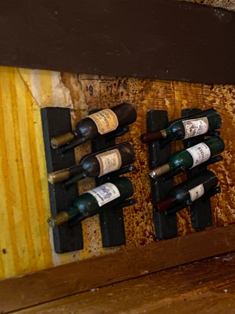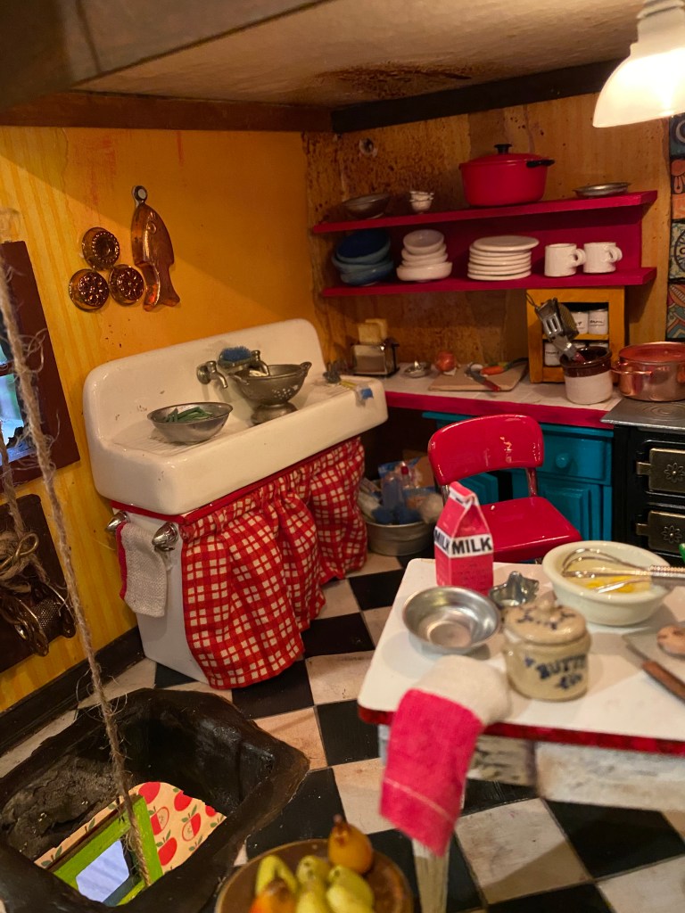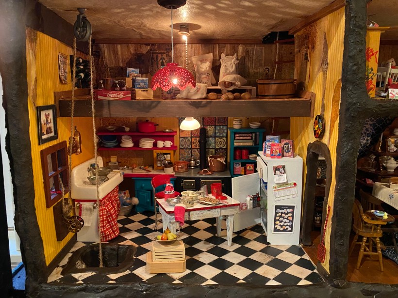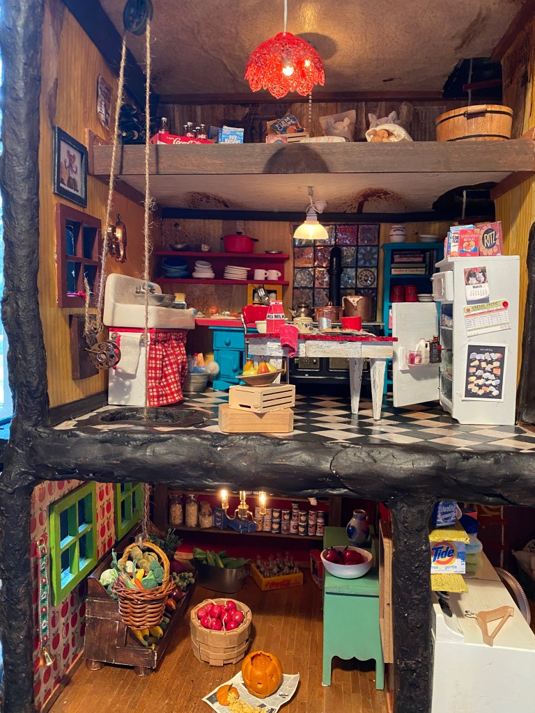There are many components to this room, including: the loft storage, the pulley system, the shelves with the spice rack I made from beads and the dishes sculpted with clay; the food, such as the spaghetti in the strainer in the sink, the onion on the cutting board, the goods in the refrigerator and the cookies on the table; the hand towels and sink skirting; the wine rack and wine bottles (made with pipettes, paint and printed labels); the pictures on the wall and fridge; the cleaning supplies under the sink, etc.