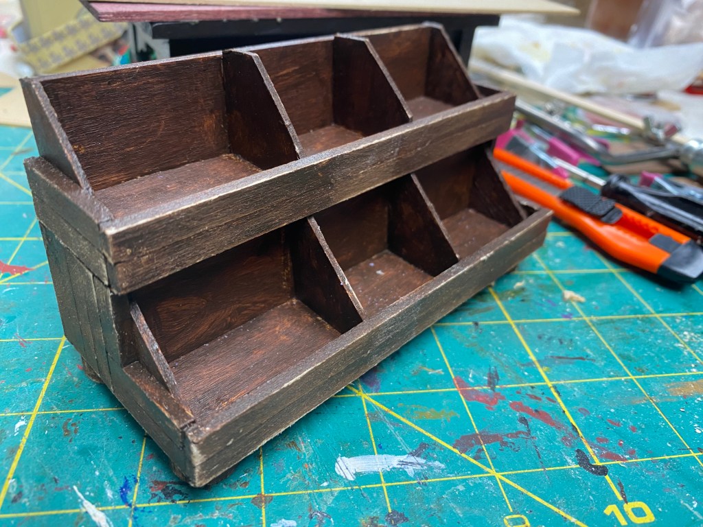 The wooden vegetable storage unit was built with basswood and then filled with many of the fruits and vegetables I sculpted out of polymer clay while in California.
