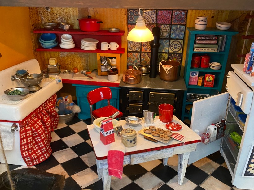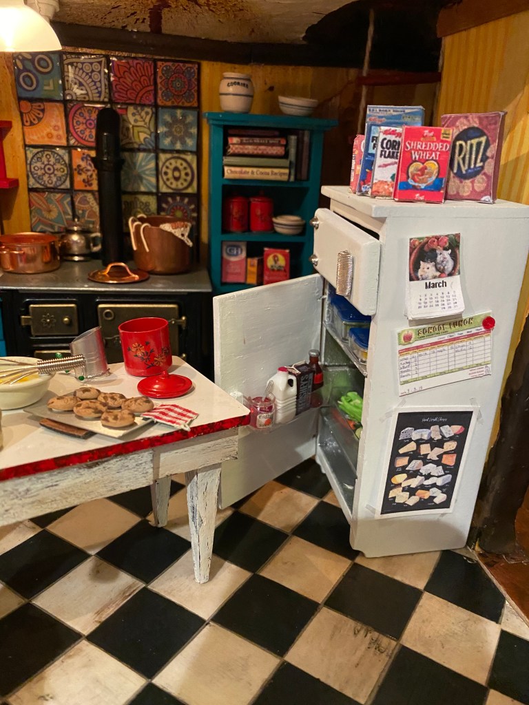 I worked the longest on the kitchen as I started designing and planning the layout from the very beginning of the seven year process. Details such as the tiled wall behind the stove (made with scrapbook paper covered in gloss), the kitchen sink set-up and the refrigerator I refurbished were made a long time ago.